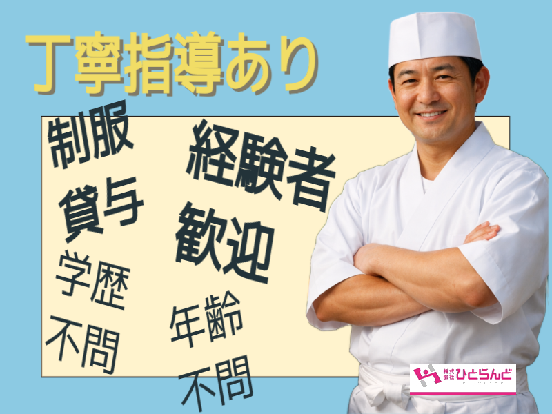和食調理の経験がある方は優遇あります。経験年数は問いません。 経験が浅い方やブランクのある方も歓迎します。 少しでも早くお仕事に慣れるていただけるように、 当店の仕事の流れや調理方法をしっかりと丁寧に指導してまいります。 和食、寿司等の調理経験を活かすことができるお仕事です。 調理師免許ある方は経験年数不問です。 経験年数が少ない方も徐々に指導してまいりますので安心です。 社保完備で制服貸与も嬉しいポイント! 無料駐車場完備で、マイカー通勤できるのも◎ (マイカー通勤できる方は尚可) |